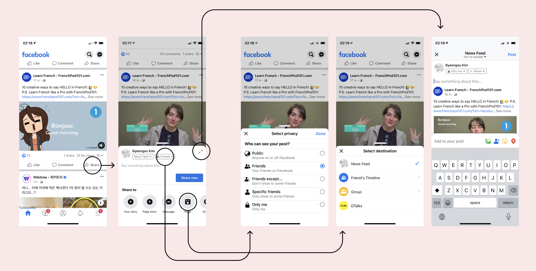 페이스북의 share 기능을 보자구. 애플은 화면을 가득 채우는 모달만을 사용하지만, 페이스북은 컨텐츠의 양만큼만 높이를 가지는 형태를 사용하고 있어. 그리고 애플의 경우는 모달이 여러 개 겹치는 경우 하나씩 꺼야만 본래 화면으로 돌아갈 수 있는 반면, 페이스북은 뎁스에 상관없이 모달을 끌어내리거나 모달 밖의 영역을 탭해서 그동안의 과정을 모두 취소할 수 있지.
