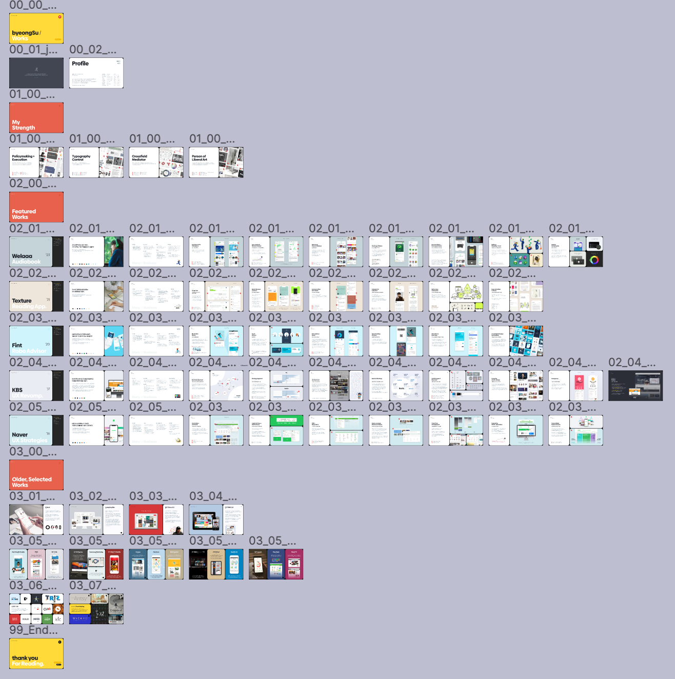 이 역시 '형식'의 덕을 톡톡히 봤어. 각각 독립적인 구조라서 막 때려 넣어도 정리가 돼 보여. 처음에 간단히 내 경력을 간략히 적고, 이전 포폴과 같이 내 장점(나는 이런 걸 잘해요, 이런 걸 좋아해요)을 소개하고, 그 뒤로는 최근의 프로젝트 다섯 개를 상세하게, 그리고 약간 중요하지만 옛날 것을 한 장에 하나만, 그리도 버리긴 아까운(?) 프로젝트를 한 장에 세 개씩, 마지막으로는 본업이 아니지만 필요할 땐 할 수 있는 일 - BX와 폰트 전체를 각각 한 장에 넣었어. 이렇게 줄이고 줄여도 70여 페이지가 나오는 건 아쉬운 부분이야. 내 압축 능력은 여기 까진가 봐.