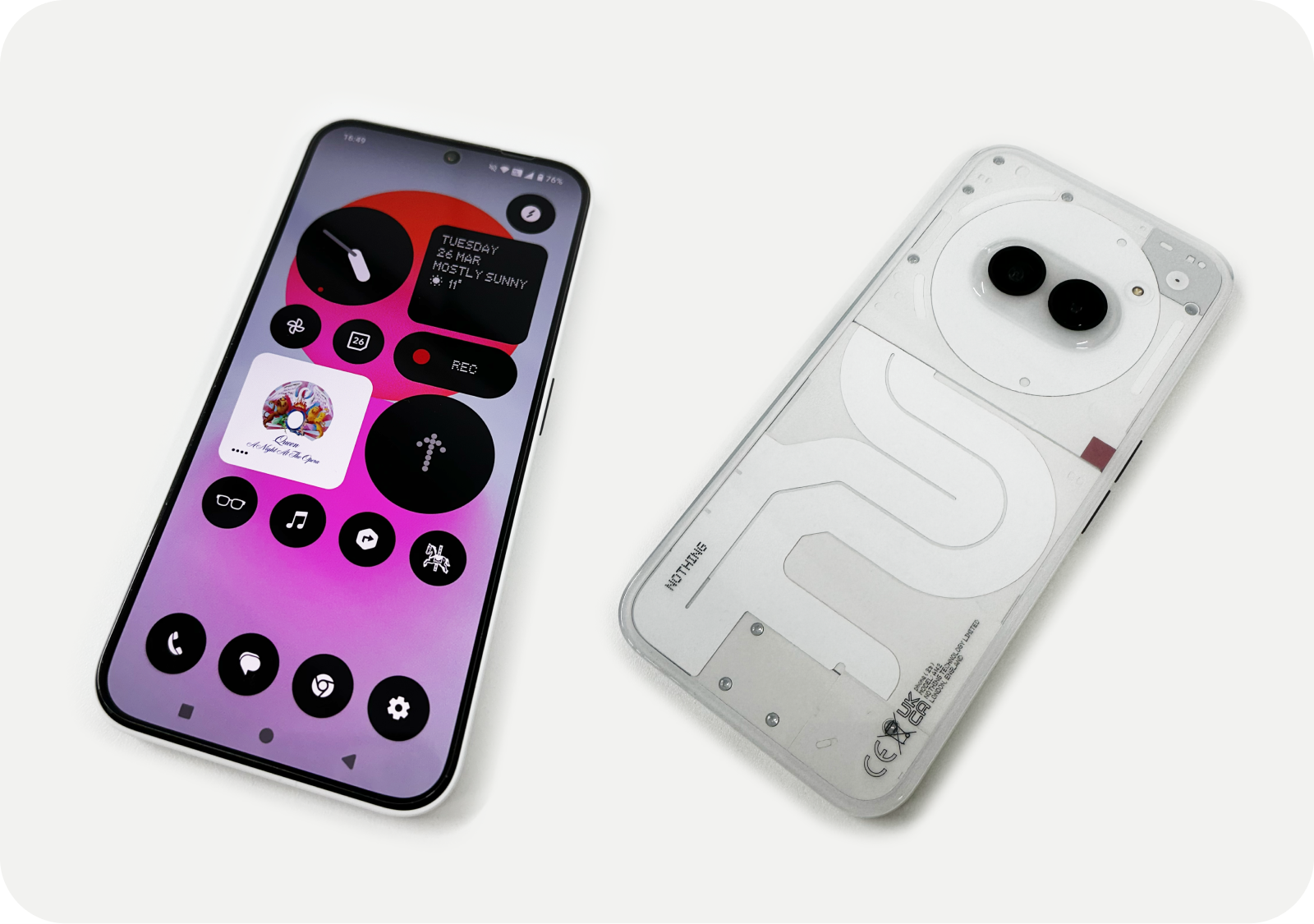 홍대병 폰이라는 타이틀에 어울리는 겉멋 들린 디자인, 좋아. 플래그십인 Nothing 2보다 디테일이 적긴 하지만, Nothing 2의 뒷면은 지나치다 싶게 작게 쪼개놓은 느낌이 없잖아서 (내 기준엔) 너무 인더스트리얼했고, 이 정도가 적당한 것 같아.