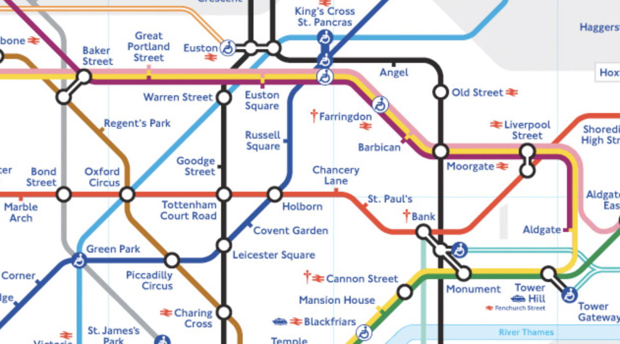 5번 항목의 경우는, 런던 지하철 노선도를 참고했어. 런던 지하철의 경우, 각 표기마다 디테일한 이유가 있어서 연결하는 방향이나 길이가 서로 다르지만, 나는 좀 더 단순하게 생각했어. 내가 환승역을 긴 원으로 그린 이유는 오로지 각 선의 진행이 점 아래서 교차하지 않도록 하기 위함이야. 그래서 모두 같은 방향으로 45도를 틀 수 있었지.
