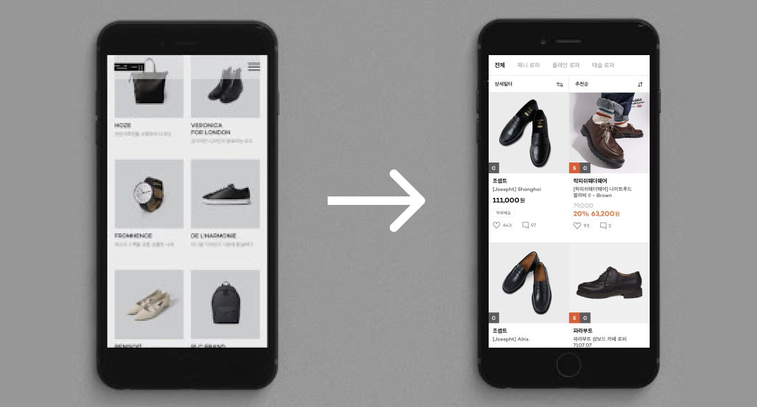 라운딩을 쓰지 않고서도 모서리의 시각적인 자극을 없앤 사례가 있지. 29CM. 초기에는 사각형의 모든 모서리를 흰색 바탕에 노출시켰는데, 현재 버전은 모서리가 드러나지 않게 섬네일을 서로 붙이는 방향으로 바뀌었어. 섬네일 이미지를 모두 통제하기 때문에, 두 섬네일을 붙여도 되는 상황이니까. (무작위 섬네일이면 에러처럼 보일 확률이 높은 형식)