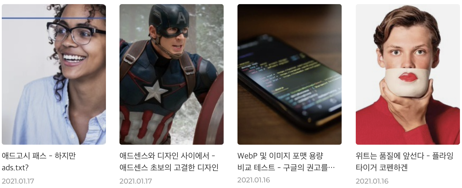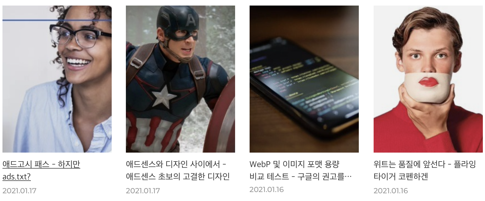 각 컨텐츠 간, 각 섬네일 간의 연결성이 없으니까 충분히 넉넉하게 라운딩을 써도 될 것 같아. 섬네일 사이의 공간이 충분히 넓기는 하지만 섬네일의 높이도 높아서 서로 영향을 주기도 해. 특히 캡틴 아메리카의 경우, 동세가 뚜렷하기 때문에 중간 흰색 여백이 마치 전면의 흰색 기둥처럼 느껴지기도 하지. 또한 이 탬플릿은, 이미지를 보다가 텍스트를 확인하러 내려가는 동선이 긴데, 섬네일 하단의 라운딩이 텍스트의 시작점을 찾는 걸 방해하는 느낌이네. 그래서, 이 캡쳐를 한 후에 - 나는 이 부분 라운딩을 10px에서 8px로 줄였어.