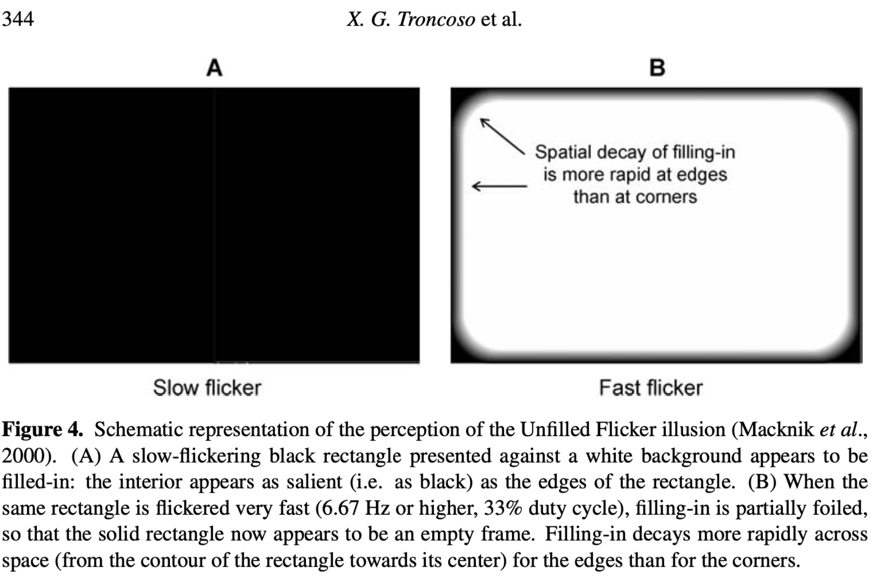 이 내용은, 흰색 배경 위에서 검은색 사각형이 느리게 깜빡일 때(왼쪽)와 빠르게 깜빡일 때 (오른쪽) 어떻게 인지하는지를 보여주는 내용이라서 본 내용과 직접적인 관련은 없지만, 인간의 눈은 모서리를 강하게 파악하면서 형태를 이해한다는 가설을 뒷받침하는 자료라고 생각해서 첨부했음.